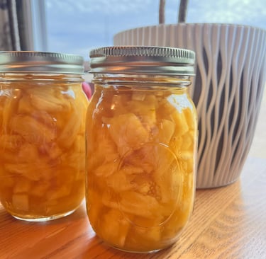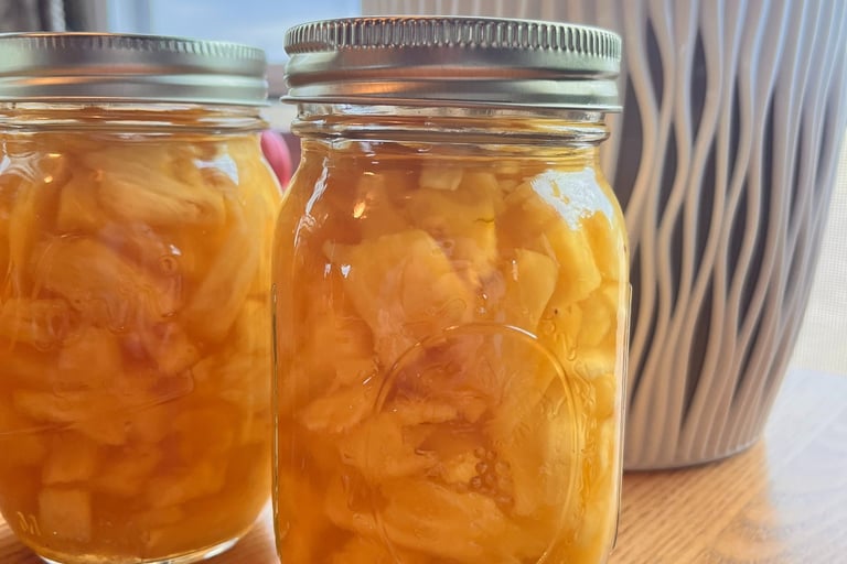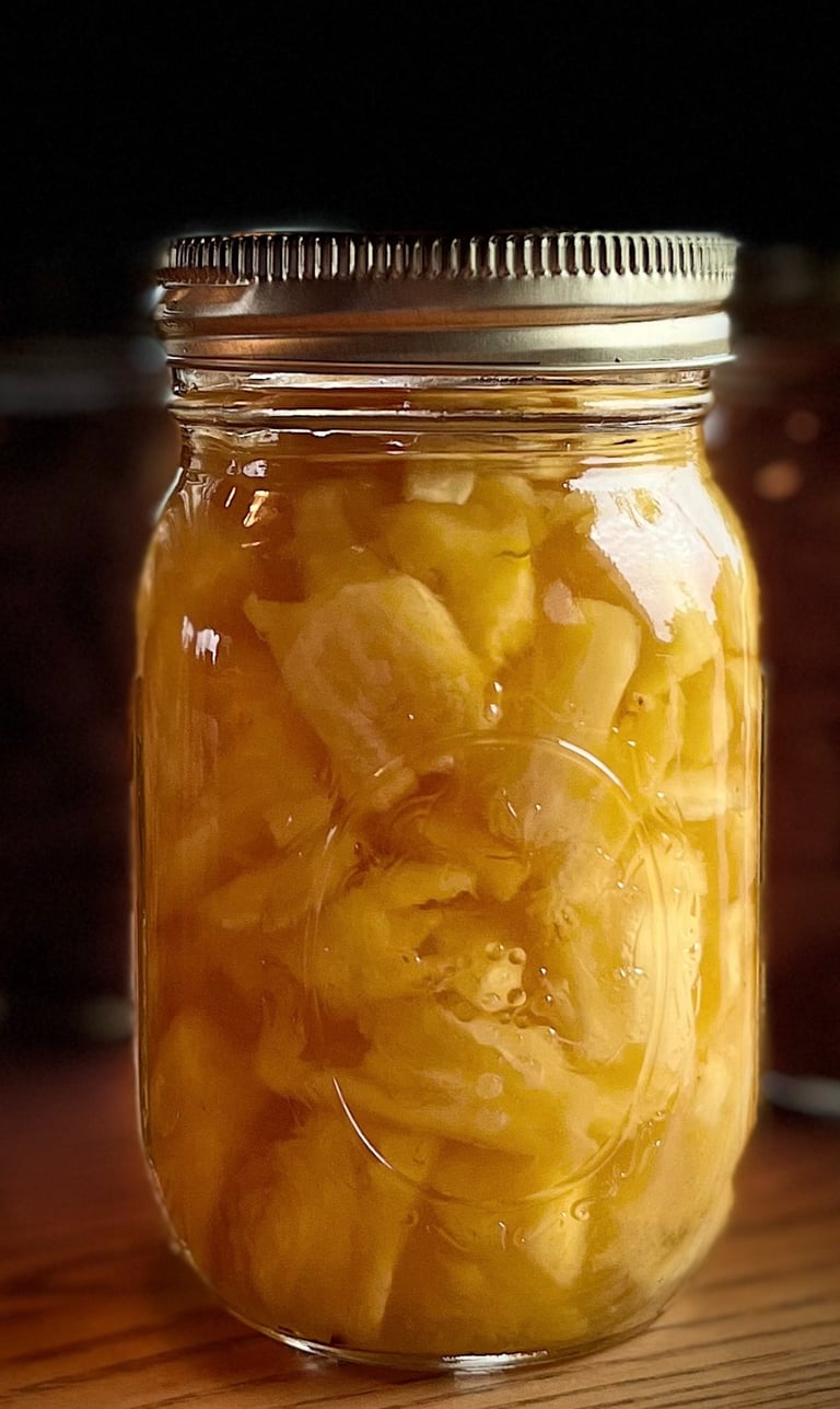 Home-canned pineapple is a jar of pure sunshine—golden, juicy pieces preserved at peak ripeness for a naturally sweet, tropical flavor. Carefully prepared and sealed, it captures the fresh taste and aroma of pineapple without unnecessary additives. Perfect for snacking, baking, or adding to savory and sweet dishes, home-canned pineapple brings a bright, homemade touch to your pantry all year long.